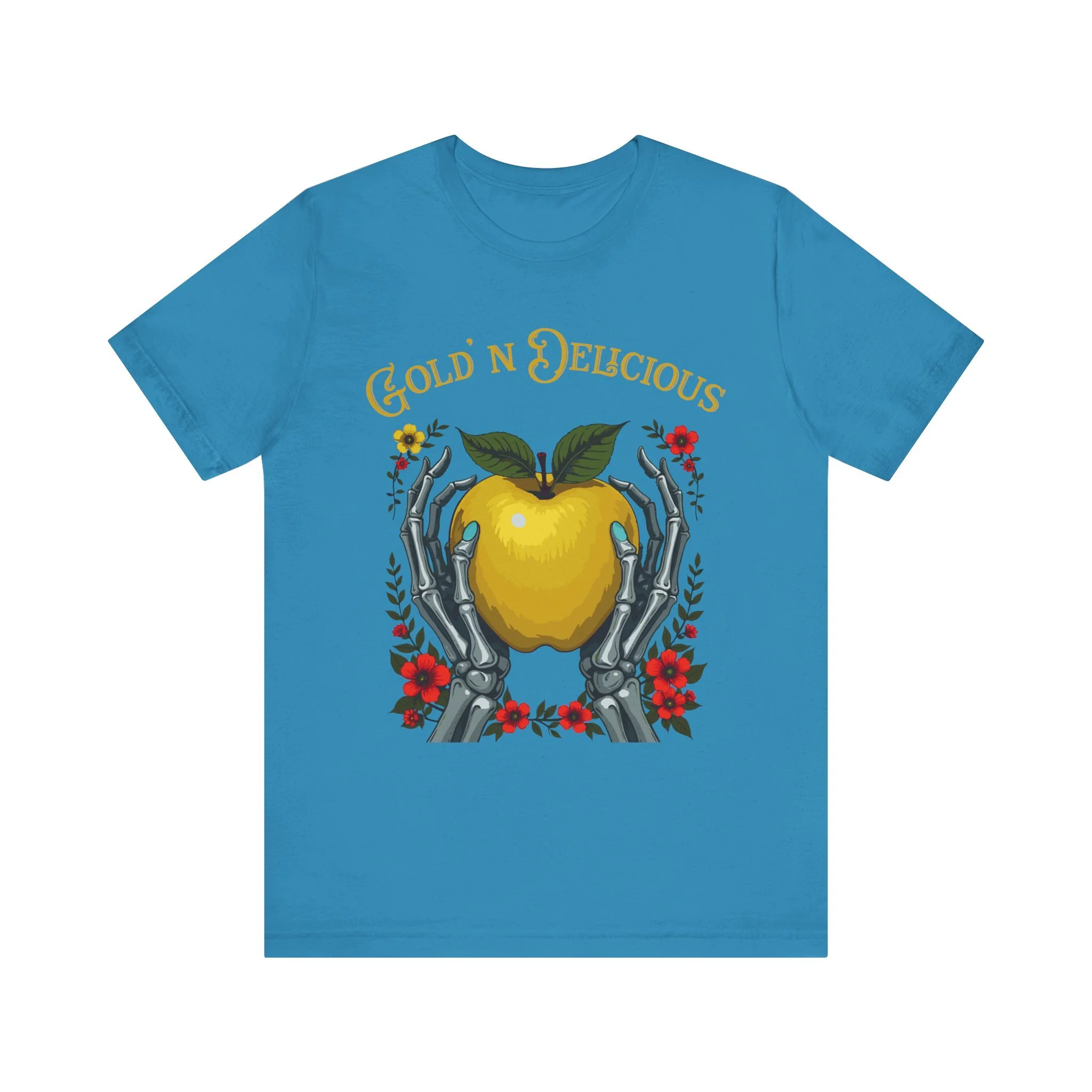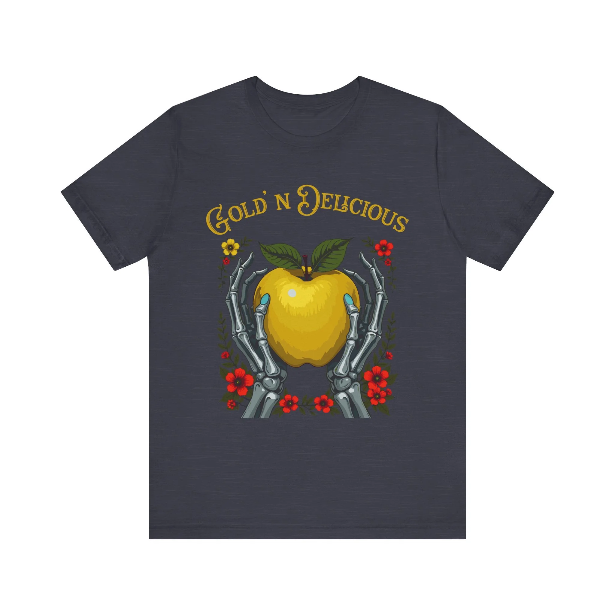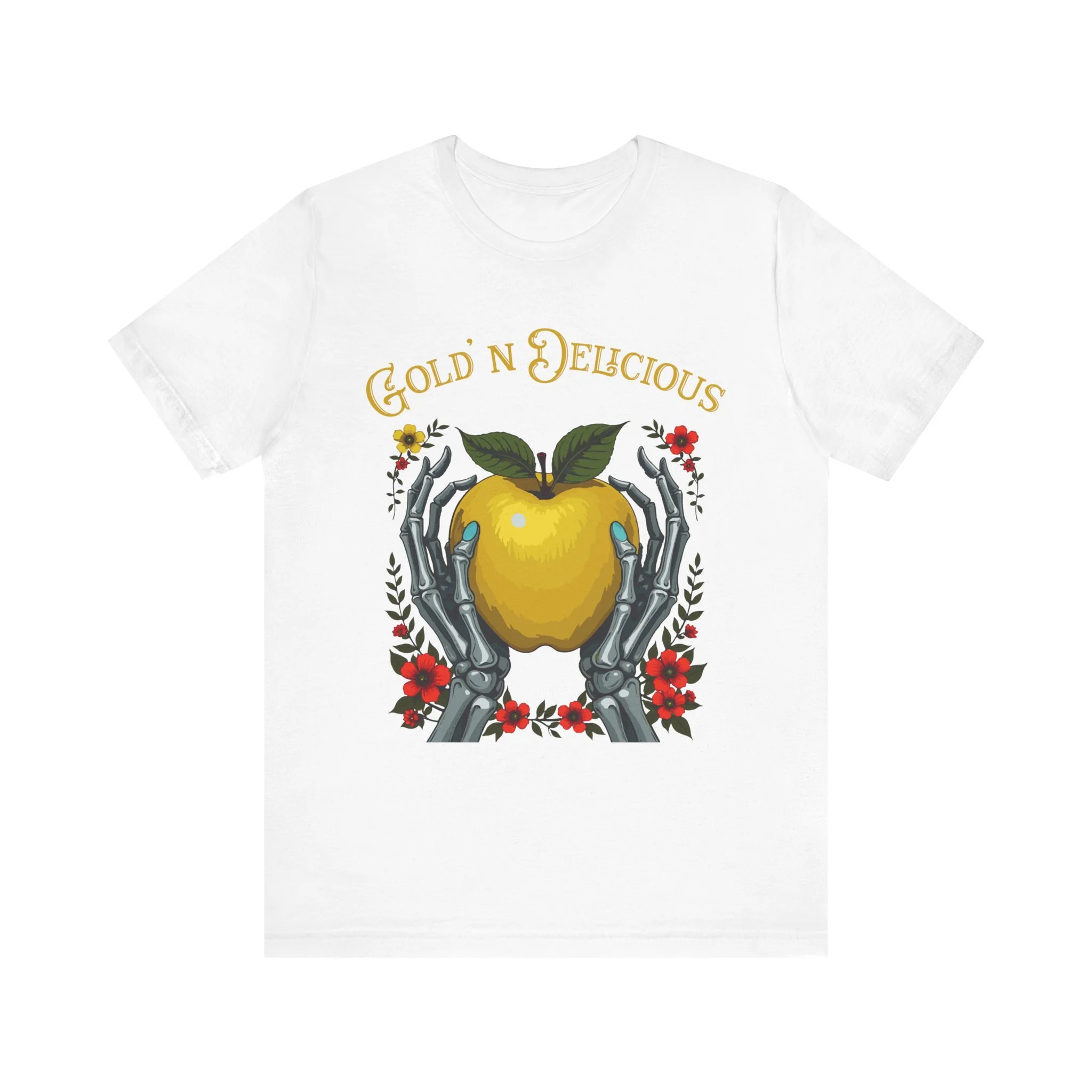 This Gold'n Delicious Unisex Jersey Short Sleeve Tee features the Gold'n Apple & Hands design. This tee boasts a modern, relaxed fit. The breathable 100% Airlume combed and ring-spun cotton fabric ensures you stay cool and comfortable with a classic crew neckline.
